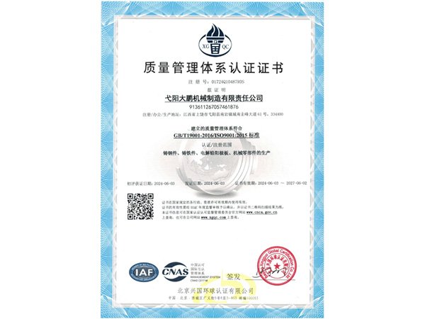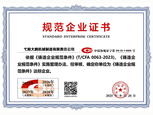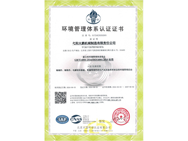 公司順利通過質量管理體系認證、環(huán)境體系認證、職業(yè)健康安全管理體系認證、環(huán)評。2015年5月獲國家工信委頒發(fā)的《鑄造企業(yè)準入條件》;2019年做了安全現狀評價;2020年取得了排污許可證。